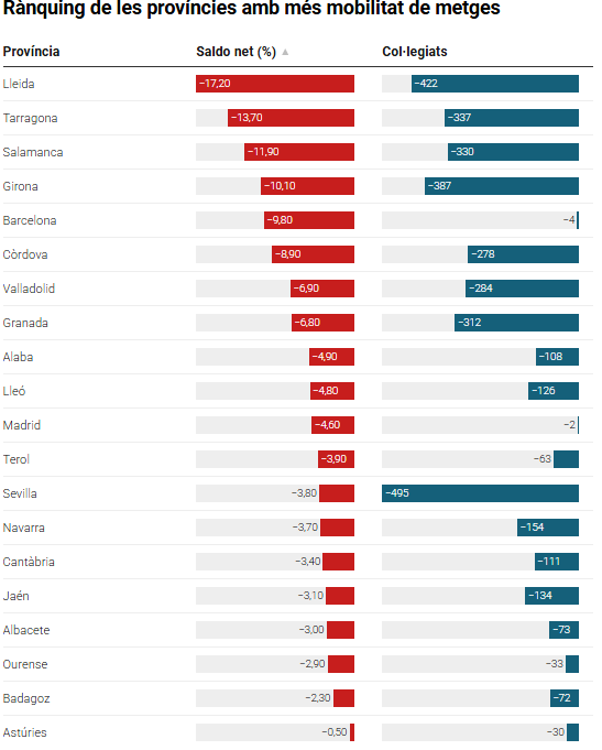 Un estudi situa Lleida com la província on hi ha més ‘fuga’ de metges a la resta de l’Estat. Concretament, 422 facultatius, que suposen el 17,2% dels seus 2.333 col·legiats, s’han traslladat a una altra demarcació a treballar. Un fet que el Col·legi de Metges atribueix a l’alta taxa d’alumnes de fora de Catalunya a Medicina de la UdL.